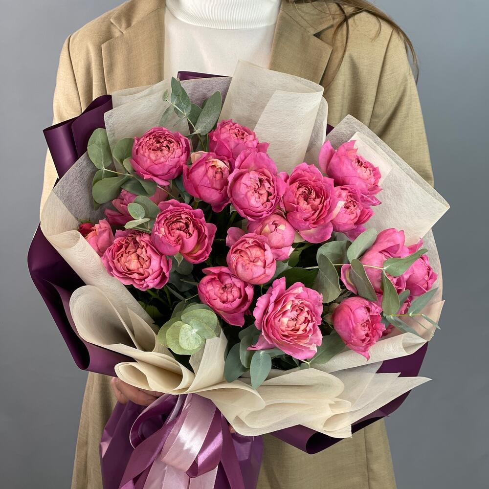 Лента – 2 шт.Эвкалипт – 2 шт.Упаковка – 2 шт.Роза Джульетта – 5 шт.