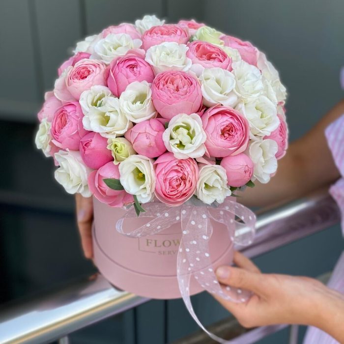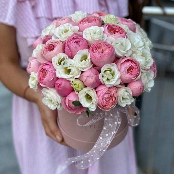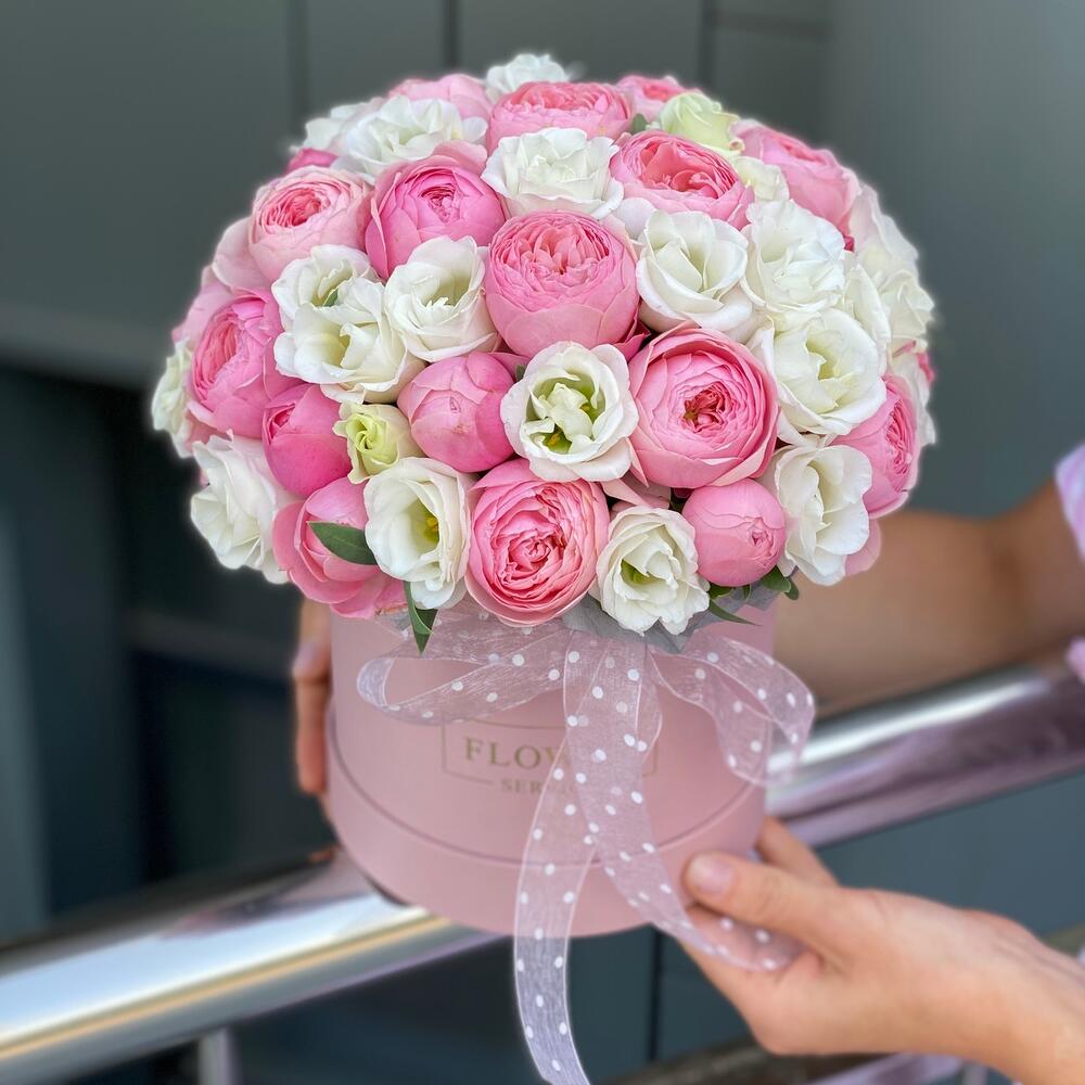 Композиция из кустовых пионовидных роз и белой эустомы в коробке !