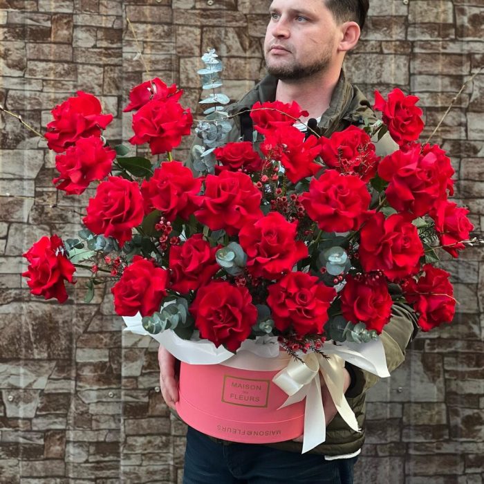 Метки: 25 роз, от 4000 до 5000 руб, Роза 80 см, Розы в коробке, цветы в коробке